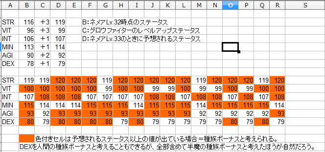 というわけで、たまたまネメアさんの必要経験値が少ないデータで検証してみることにしました。