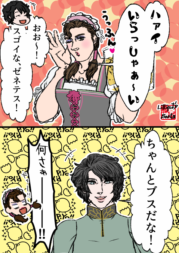一応、オクトーバーフェストのつもりで描いたんですけど、調べてみたらオクトーバーフェストって9月の終わりごろから10月の頭くらいにやるもんで、季節外れもいいところだったみたいです。まぁ、普通はこの季節っつったらハロウィンだわな……。
