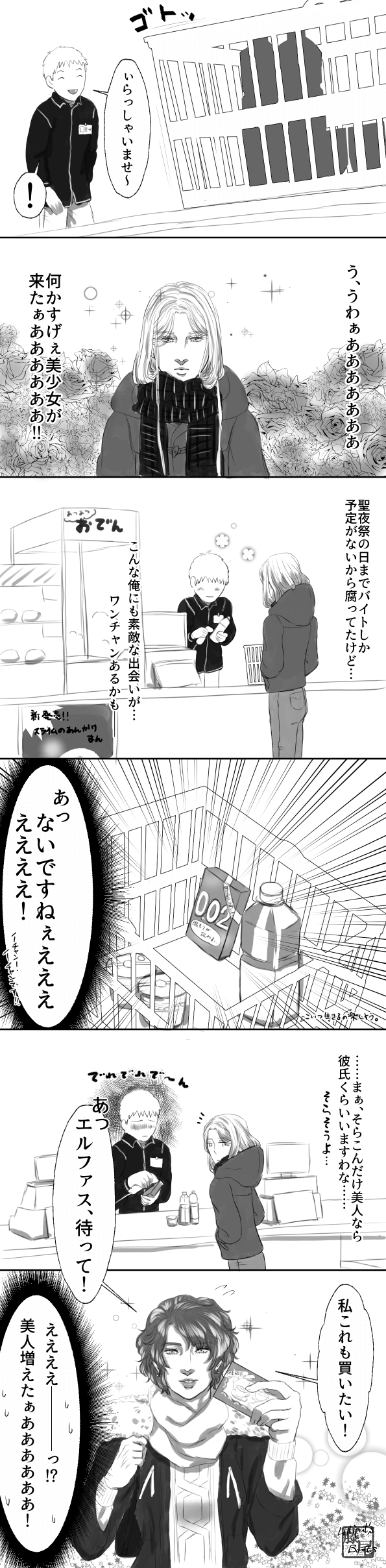 店を出るときエルファスが店員を睨んでいるのは、「僕のレインに心配されやがってこの野郎」という心のせっまいせっまい嫉妬心です。私の書くエルファスは、レイン以外に心を開いてないので、心はめちゃめちゃ狭いです。でも声に出すとレインにたしなめられるので、言わない。