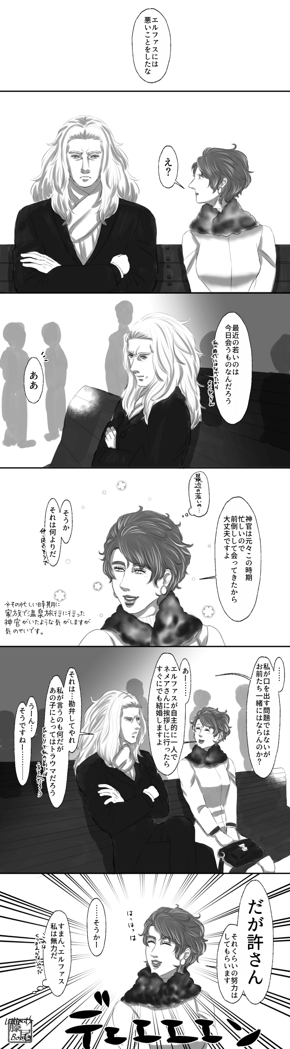 レインとエルファスはとっとと結婚してそうなのに、まだ結婚してない理由を考えたらこうなりました。エルファスにとっては試練ですね。