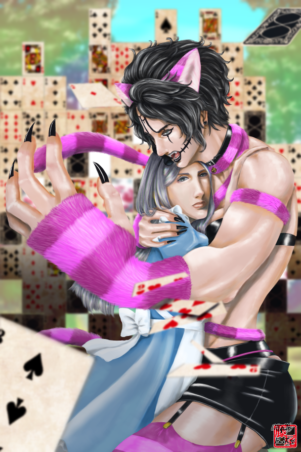 昔の絵をまた上げるの恥ずかしいんですけど、一応上げますね……。3年前のアリスとチェシャ猫です。