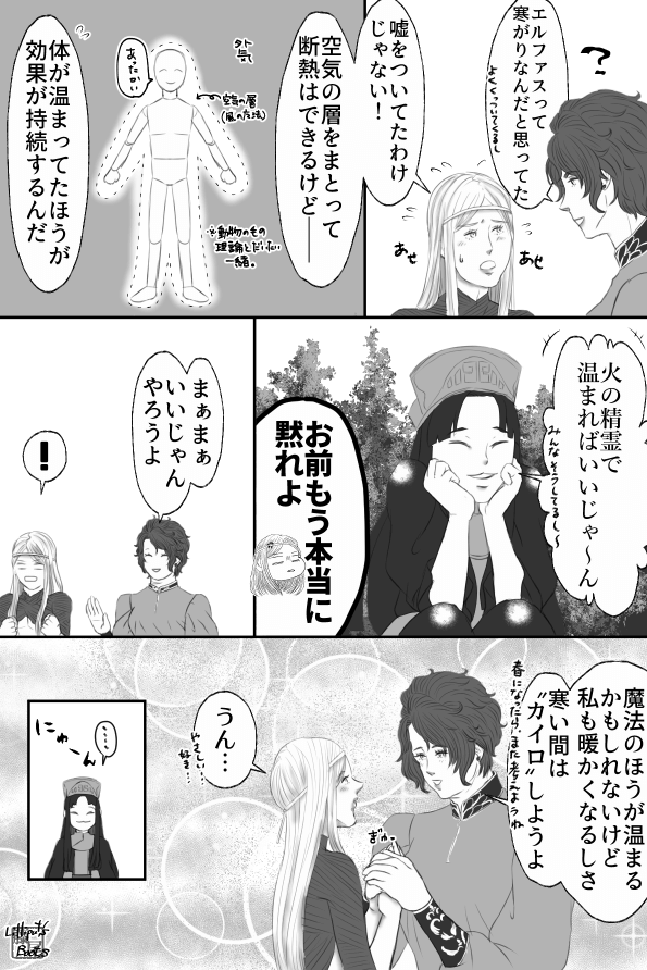 風を操れるってことは空気をその場に留めることも可能だということ……! というわけで、私の設定では、風の魔法で外気を遮断しているということになりました。これだと鼻とかも暖かそうでいいですね。冬、鼻寒いっすもんね~。