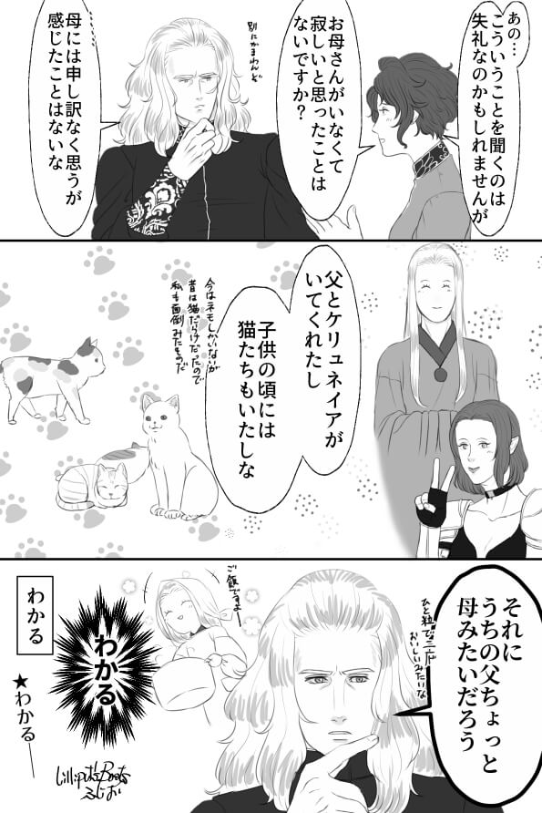 わかる 2019-05-30 05/23,26に拍手ありがとうございました! メッセージもありがとうございました! 猫屋敷はいいぞ! 先週から続いてるような続いてないような…… わかりみも深けりゃバブみも深い。 半年しか変わらない年子二人なんて、オルファウスさんめちゃくちゃ大変だっただろうなぁと思います。そういう話も描きたいけど画力が足りなさすぎて如何ともし難い。