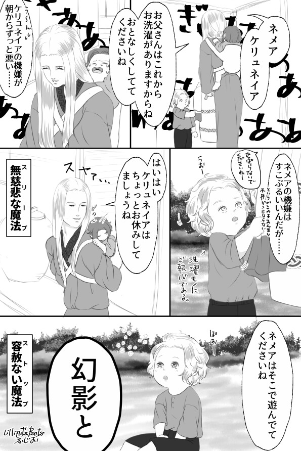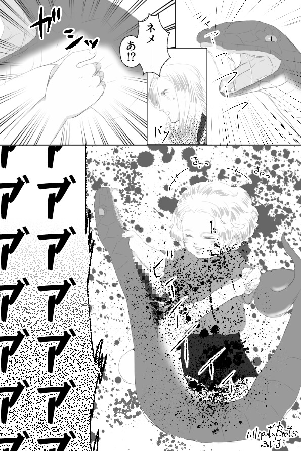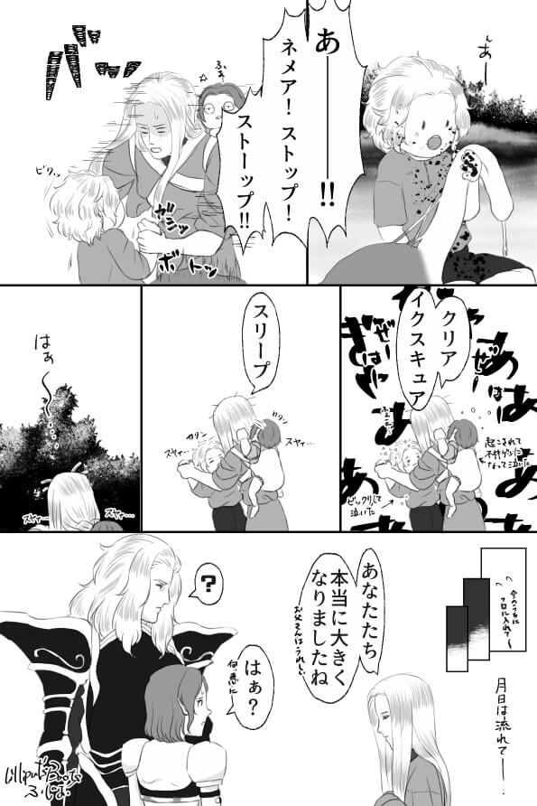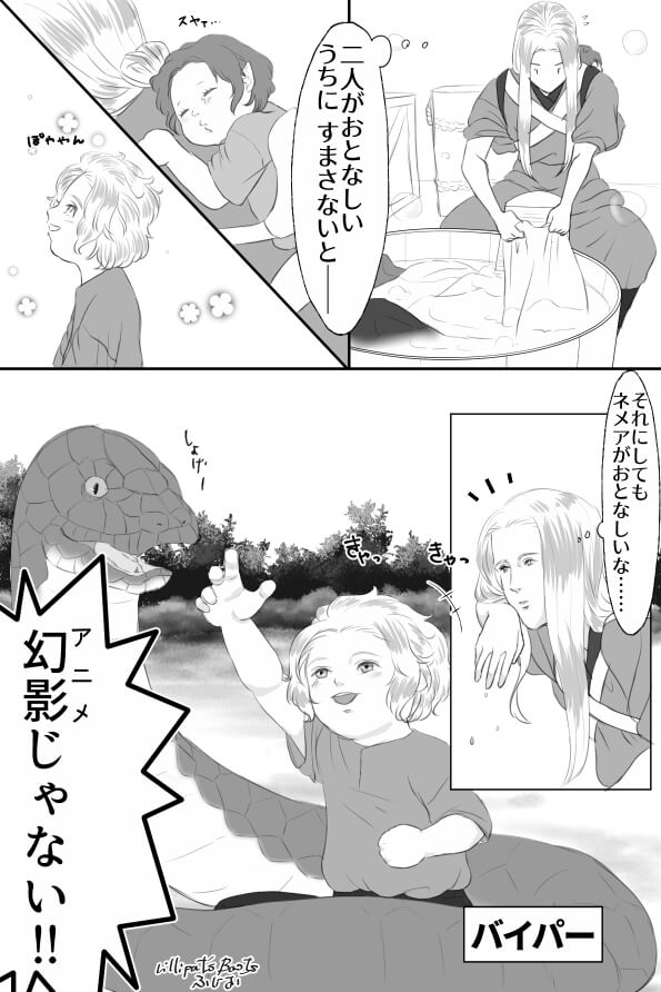 これ、描きながら「オルファウスさんなら庭に危険生物が入ってこないようにしてるだろうなぁ」と思いました。ただ、幼ネメアさんが蛇を引きちぎる様が描きたかったので、うっかりバイパーが侵入したことになりました。