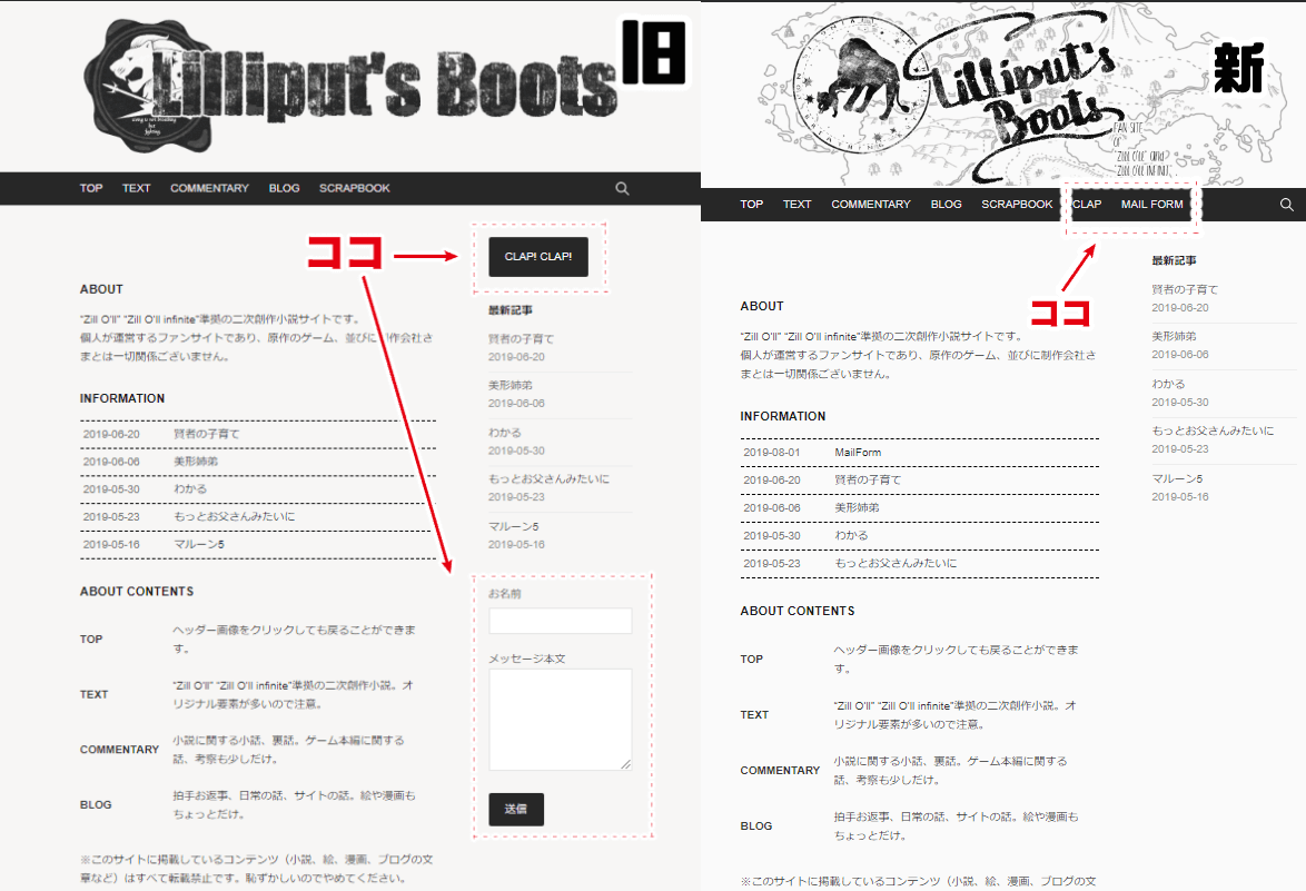 あと、サイトのTOP画とサイトカラーが変わりました。それから、拍手とメルフォの位置が今までサイドバーだったのが、グローバルメニューに変わりました。