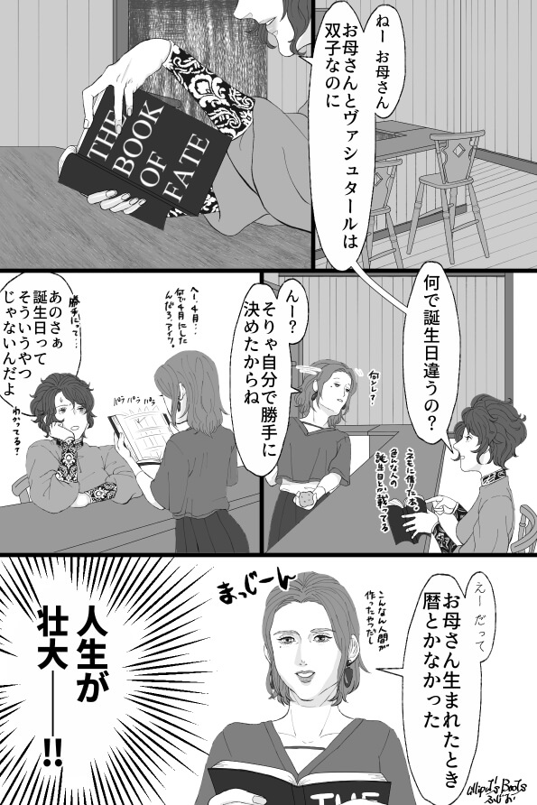 漫画で描いたやつ。アスティアは人間に化ける必要があったので、自分で適当な日付を上げたんじゃないかと思います。子供がいますからね。子供に「私の誕生日いつなの?」って聞かれて、そこから「お母さんの誕生日は?」ってなる可能性はかなりあると思います。