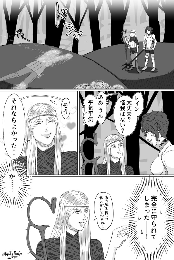 イズのときは震えて何もできなかったエルファスが、ラストバトルでネメアと対峙しても、拒絶を示さなかったのは成長の表れだと思っています。エルファスの立場から見ると、ネメアのやったことは到底許せることではないし、許す必要もないと思うのですが、とりあえず自分の感情は置いておいて、目の前の問題を協力して解決しようとするって、昔のエルファスじゃ考えられないですもん。