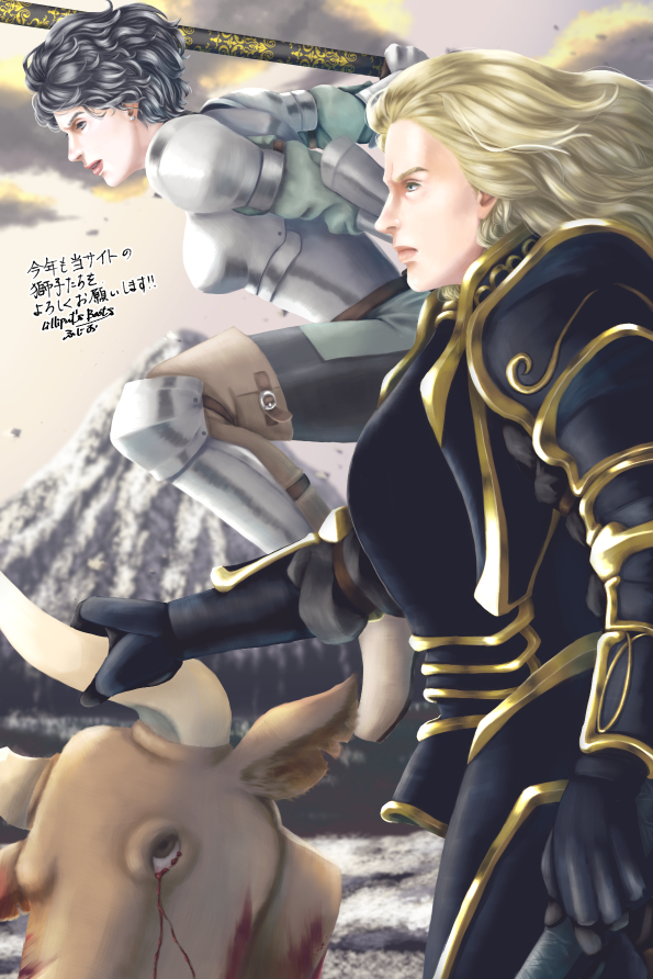 いつも二人が棒立ちしてる構図ばっかりだったので、たまにはとちょっと動きのある構図にしてみました。それから、今年は丑年なので、ミノタウロスを描きました。