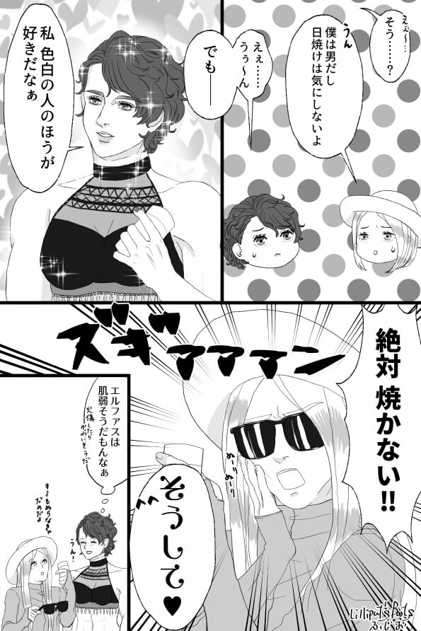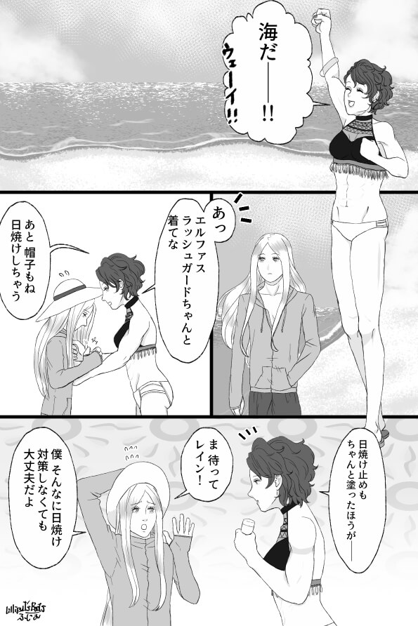 海へ行く 2021-09-02 08/29に拍手ありがとうございました! 久しぶりに漫画描きましたね。 エルファスは「男だから日焼けなんて気にしない」と言ってますが、最近は男の人でも日焼け気にするよね。そっちのほうがいいよ。単純にひと昔前とは日差しの強さが全然違うもんね。皮膚に悪い。 白人さんは日差しに耐性がない人が多いので、あえて日サロで軽く焼いて、耐性つけたりするそうですね。沖縄に駐屯してる米兵さんが言ってました。 エルファスは日焼けすると真っ赤になって痛くなりそうですね。