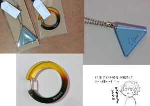 アクリルキーホルダーシリーズ、ほかにも星とかハートとかいろんな形があったんですけど、エルファスで作るなら絶対三角形だろうと思いました。これは三位一体を表してます。