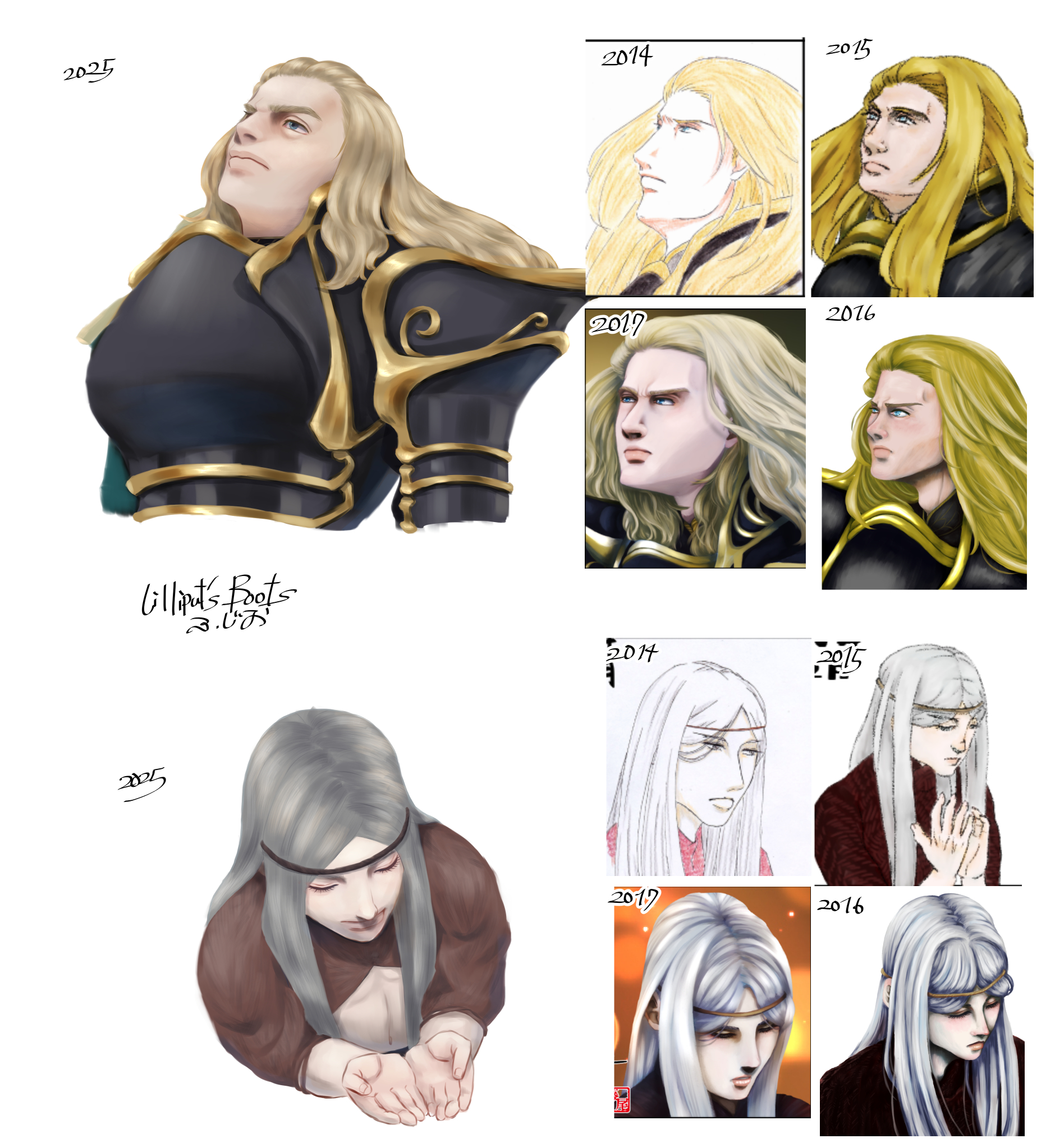 あの~……それでですね。昔、テンプレートを使って色んなキャラを色んな角度で描いてまして、1年に一回描いていけば自分の成長が見れるのではないかと何年か描いたんです。それで、この二人も描いたな~と画像を引っ張り出してきたんですけど……。